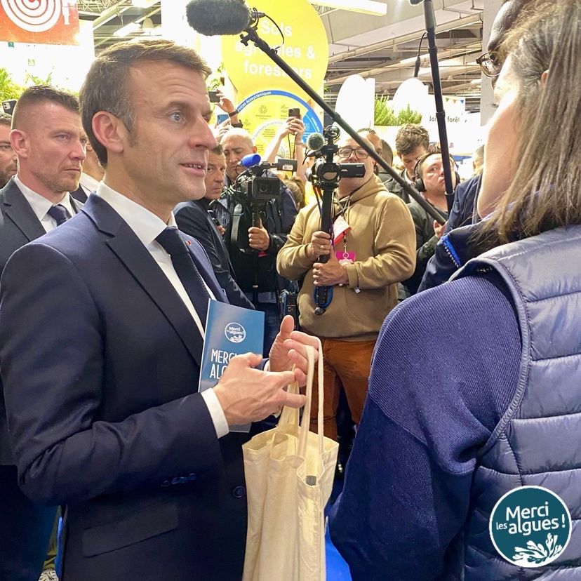 On the first day of the Salon International de l'Agriculture (SIA) 2024, Jeanne-Marie ROBERT (Food & Health, 2017, Beauvais), host at Merci les Algues, had the honor of meeting French President Emmanuel Macron and Hervé Berville, Secretary of State for the Sea. The meeting was an opportunity to highlight the challenges and achievements of the algae industry, not only in terms of food, but also sustainable agriculture.