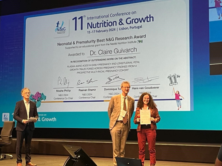 C’est lors de la cérémonie d’ouverture de la Conférence internationale sur la nutrition et la croissance (N&G) que Claire GUIVARCH (Alimentation & Santé, 2019, Beauvais) a reçu le Prix de la Meilleure Recherche dans la catégorie Néonatologie et Prématurité pour ses travaux sur "Les Acides Aminés Plasmatiques en Début de Grossesse et les Trajectoires de Croissance Fœtale Longitudinales Pendant la Grossesse : Résultats d'une Cohorte de Grossesse Prospective Multi-ethnique".