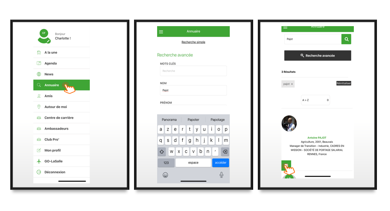 L'annuaire dans votre poche vous permettra de retrouver adresse email et numéro de téléphone de vos anciens camarades.