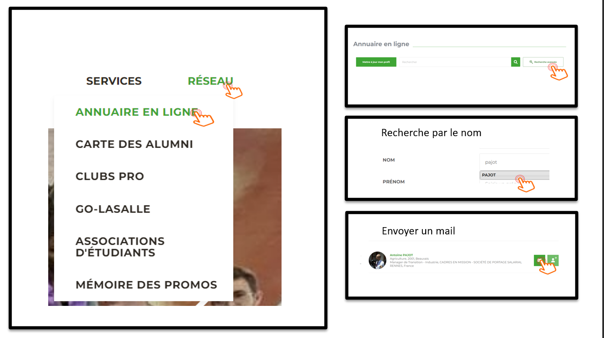 Vous êtes à la recherche d'un Alumni ?! Que ce soit via le site internet ou l'application mobile, plusieurs possibilités s'offrent à vous pour le retrouver !