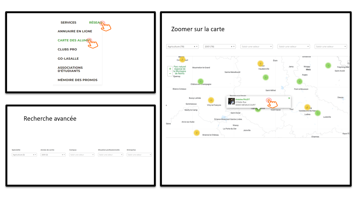 La carte vous permet de trouver un Alumni selon son adresse enregistrée dans l'annuaire. Des filtres existent comme l'année de sortie, la formation, le campus ou encore l'entreprise dans laquelle il travaille.