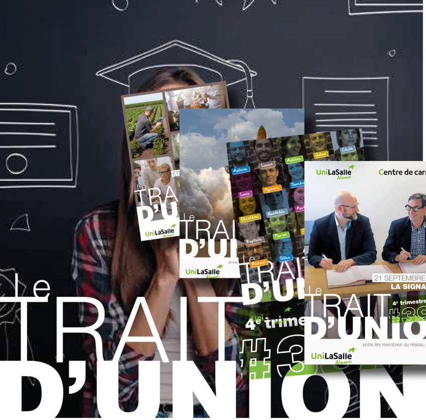 Depuis le 1er janvier 2019, l'ensemble des services d'UniLaSalle Alumni est ouvert à tous. Le Trait d'Union est donc désormais consultable, dans sa version digitale, par l'ensemble des Anciens Élèves d'UniLaSalle. Pour ceux, attachés à la version papier, il est possible de s'y abonner pour le prix de 20 €/an. Quatre numéros de 52 pages rythment l'année et vous permettent de prendre connaissances des actualités concernant l'Institut, de découvrir le Portrait d'un Alumni de chacune des spécialités (Agriculture, Beauvais ou Rouen - Alimentation & Santé - Géologie - Environnement), de prendre connaissances des différentes actualités du réseau par le biais des week-end de promotions, de la vie d'UniLaSalle Alumni,... sans oublier le Dossier spécial qui chaque trimestre traite d'un sujet de fond. Ah si ! N'oublions pas le Carnet qui permet à tout un chacun de s'informer des nominations, mariages, naissances, décès,... Bref un format A5 (21 x 14.5cm) qui ne vous laissera pas indifférent.
