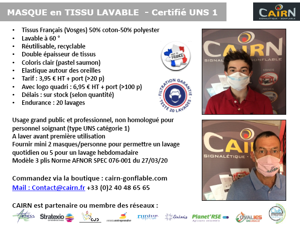 François AUGER (Agriculture, 1989, Beauvais), Directeur général de l'entreprise CAIRN relance la production de masques en tissus avec logos pour les besoins des professionnels ou particuliers.