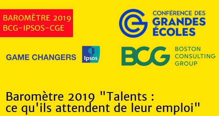 BCG-Ipsos-CGE lancent l’édition 2019 du baromètre "Talents : ce qu'ils attendent de leur emploi" auprès des étudiants et Alumni et vous mettent une nouvelle fois à contribution. Les consultations menées par Ipsos en 2015 et 2017 pour BCG en partenariat avec la CGE, ont connu grâce à votre collaboration, une forte participation.