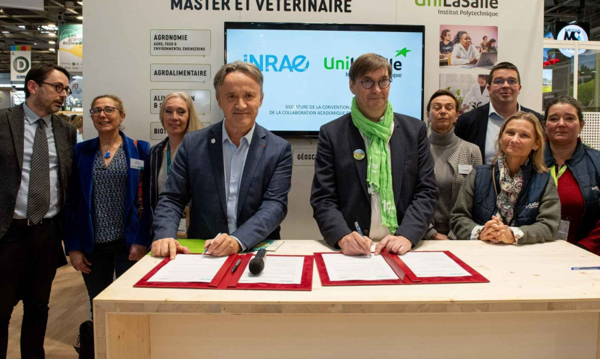 Philippe Mauguin, président-directeur général d’INRAE et Sébastien WINDSOR, président d’UniLaSalle ont signé pour la première fois une convention de partenariat ambitieuse engageant les deux organismes autour de projets communs de recherche-formation à l’échelle des agroécosystèmes et des systèmes de production et de transformation, dans une dimension territoriale, nationale internationale. Ce partenariat a été annoncé officiellement vendredi 28 février à 17h15 lors du Salon international de l’Agriculture, sur le stand d’UniLaSalle.