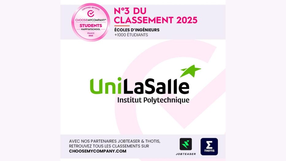Comme en 2024, UniLaSalle se hisse sur le podium national des écoles d’ingénieurs les plus appréciées de leurs étudiants, derrière l’ICAM et les Mines Paris PSL.